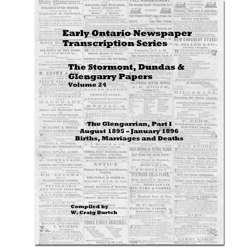 The Stormont, Dundas & Glengarry County Papers, Volume 24 of Burtch's Ontario Newspaper Transcription Series offers precise newspaper transcriptions of genealogical records of births, marriages, and deaths.